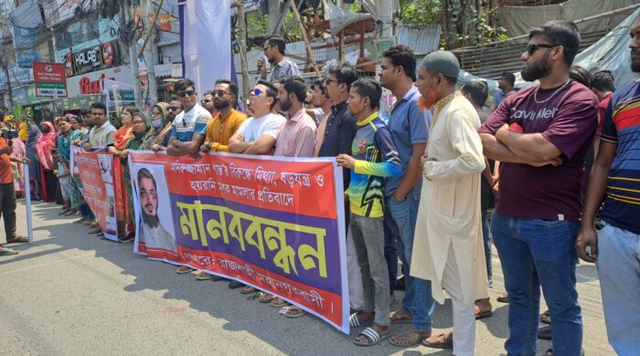 রাজশাহী মহানগরের বোয়ালিয়া থানা পশ্চিম স্বেচ্ছাসেবক দলের আহ্বায়ক ও পদ্মা গার্ডেন এলাকার বাসিন্দা মনিরুজ্জামান শান্তর বিরুদ্ধে দায়েরকৃত মিথ্যা, ষড়যন্ত্রমূলক ও হয়রানিমূলক মামলার প্রতিবাদে মানববন্ধন অনুষ্ঠিত হয়েছে।