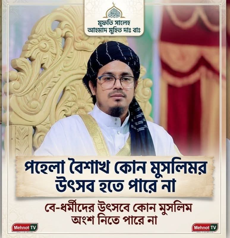 বাংলা নববর্ষ ১৪৩৩ উপলক্ষে পহেলা বৈশাখ নিয়ে মন্তব্য করেছেন আল মকবুল তাহফিজুল কুরআন একাডেমী ও হিফজ মাদ্রাসার প্রিন্সিপাল মুফতি সালেহ আহমাদ মুহিত। তিনি বলেন, পহেলা বৈশাখ কোনোভাবেই মুসলমানদের ধর্মীয় উৎসব হতে পারে না এটি একটি সাংস্কৃতিক আয়োজন মাত্র, যার সঙ্গে ইসলামের ইবাদত বা ধর্মীয় বিধানের কোনো সম্পৃক্ততা নেই। মঙ্গলবার (১৪৩৩ বাংলা সনের বৈশাখের প্রথম দিন) ফেসবুকে তিনি এসব কথা বলেন।