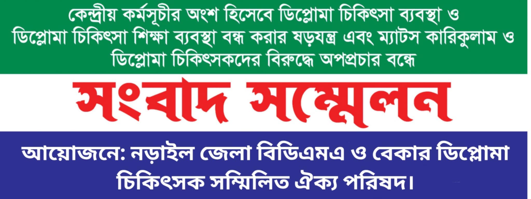 উজ্জ্বল রায়,(নড়াইল)জেলা প্রতিনিধিঃ নড়াইলে ডিপ্লোমা মেডিকেল অ্যাসোসিয়েশনের ৪ দফা দাবিতে। উজ্জ্বল রায়, নড়াইল জেলা প্রতিনিধি জানান, রবিবার দুপুরে নড়াইল শহরের নড়াইল আইটি সেন্টারের সবাকক্ষে সংবাদ সম্মেলন করে নিজেদের দাবি তুলে ধরেন অ্যাসোসিয়েশনের নেতারা।সংবাদ সম্মেলনে বক্তব্য দেন, ডিপ্লোমা চিকিৎসক ইন্দ্রজিৎ কুন্ডু, ডিপ্লোমা চিকিৎসক হেলালউদ্দিন, ডিপ্লোমা চিকিৎসক সনজিৎ কুমার, ডিপ্লোমা চিকিৎসক রায়হানউদ্দিনসহ অনেকে।