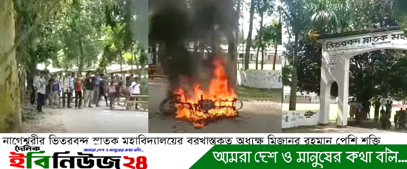 রুহুল আমিন রুকু কুড়িগ্রাম,প্রতিনিধি: কুড়িগ্রামের নাগেশ্বরী উপজেলাধীন ভিতরবন্দ ইউনিয়নের ঐতিহ্যবাহি শিক্ষা প্রতিষ্ঠান ভিতরবন্দ স্নাতক মহাবিদ্যালয়ের বরখাস্তকৃত অধ্যক্ষ মিজানুর রহমান বুলবুল পেশি শক্তি দেখাতে গিয়ে বৈষম্য বিরোধী ছাত্র-জনতার হামলার শিকার হয়েছেন। এ সময় ভিতরবন্দ স্নাতক মহাবিদ্যালয়ের সামনে বরখাস্তকৃত অধ্যক্ষ মিজানুর রহমানের ব্যক্তিগত ব্যবহৃত মোটর সাইকেলটিতে আগুন দিয়ে পুড়িয়ে দেয়া হয়েছে।