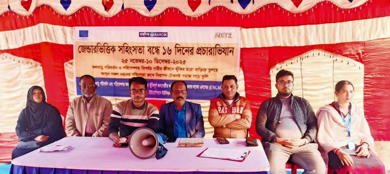 জলবায়ু পরিবর্তন ও পরিবেশগত বিপর্যয় নারীর জীবনে ঝুঁকির মাত্রা বাড়িয়ে তুলছে তাই আসুন সকল ধরনের সহিংসতা রুখে নিরাপদ টেকসই সমাজ গড়ে তুলি এই প্রতিপাদ্যকে সামনে রেখে খুলনার পাইকগাছা উপজেলায় জেন্ডারভিত্তিক সহিংসতা বন্ধে ১৬ দিনের প্রচারাভিযান অনুষ্ঠিত হয়েছে।