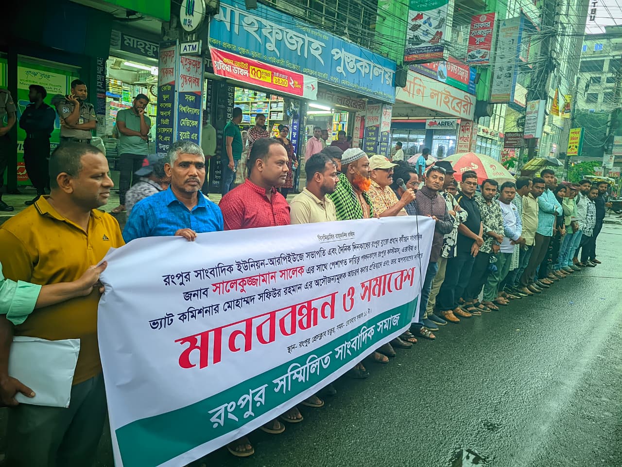 রংপুর কাস্টমস, এক্সাইজ ও ভ্যাট কমিশনার মোহাম্মদ সফিউর রহমানের বিরুদ্ধে অসৌজন্যমূলক আচরণের অভিযোগে মানববন্ধন ও প্রতিবাদ সমাবেশ করেছেন রংপুর সম্মিলিত সাংবাদিক সমাজ। রংপুরে পেশাগত দায়িত্ব পালনকালে এক জ্যেষ্ঠ সাংবাদিকের সঙ্গে অসৌজন্যমূলক আচরণের ঘটনায় নিন্দা ও প্রতিবাদে সরব হয়ে উঠেছে রংপুরের সাংবাদিক সমাজ। রংপুর সাংবাদিক ইউনিয়ন (আরপিইউজে)-এর সভাপতি ও দৈনিক দিনকাল পত্রিকার রংপুর ব্যুরো প্রধান সালেকুজ্জামান সালেক গত বৃহস্পতিবার (২৩ এপ্রিল) রংপুর কাস্টমস, এক্সাইজ ও ভ্যাট কমিশনারের কার্যালয়ে পেশাগত দায়িত্ব পালনকালে অসৌজন্যমূলক আচরণের শিকার হন। এ ঘটনায় সংশ্লিষ্ট কর্মকর্তা মোহাম্মদ সফিউর রহমান-এর বিরুদ্ধে অভিযোগ ওঠে। ঘটনাটি প্রকাশ্যে আসার পর থেকেই সাংবাদিক মহলে ব্যাপক প্রতিক্রিয়া সৃষ্টি হয়েছে।