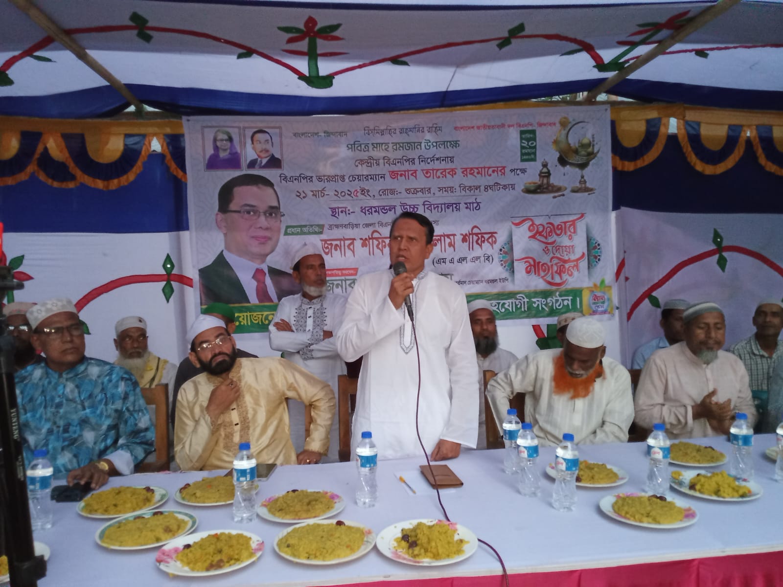 নাসিরনগরে বিএনপি'র গন ইফতার দোয়া মাহফিলঃ নিহারেন্দুচক্রবর্তী,নাসিরনগর,ব্রাহ্মণবাড়িয়াঃ ব্রাহ্মণবাড়িয়ার নাসিরনগর উপজেলার ধরমন্ডল ইউনিয়নের হাই স্কুল মাঠে বিএনপি'র গণ ইফতার ও দোয়া মাহফিল অনুষ্ঠিত হয়েছে।ধরমন্ডল ইউনিয়ন বিএনপি'র আয়োজনে ও ব্রাহ্মণবাড়িয়া জেলা বিএনপির সদস্য ও বিএনপির মননোয়ন প্রত্যাশী সংসদ সদস্য প্রার্থী মো. শফিকুল ইসলাম শফিক এর সার্বিক সহযোগিতায় শুক্রবার(২১ মার্চ) বিকেলে ইফতার পূর্ব আলোচনা সভা ও দোয়া মাহফিল অনুষ্ঠিত হয়।ধরমন্ডল ইউনিয়ন বিএনপির সভাপতি ও বর্তমান ইউপি চেয়ারম্যান শফিকুল ইসলাম এর সভাপতিত্বে ও ধরমন্ডল ইউনিয়ন যুবদলের সভাপতি ফরহাদ হোসেন এর সঞ্চালনায় এতে প্রধান অতিথির বক্তব্য রাখেন জেলা বিএনপি'র সদস্য ও ব্রাহ্মণবাড়িয়া-১ আসনের দলীয় মননোয়ন প্রত্যাশী সংসদ সদস্য পদপ্রার্থী মো. শফিকুল ইসলাম।