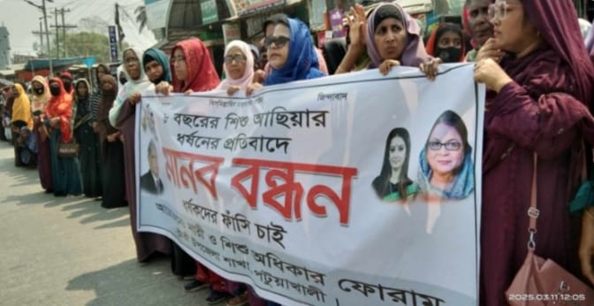 সাকিব হোসেন, পটুয়াখালী জেলা প্রতিনিধিঃ মাগুড়ায় শিশু আছিয়া ধর্ষনের প্রতিবাদে দুমকিতে নারী ও শিশু অধিকার ফোরামের নের্তৃত্ত্বে মানববন্ধন কর্মসূচি পালিত হয়েছে। মঙ্গলবার বেলা ১২ টায় দুমকি নতুন বাজারে (লেবুখালি -বাউফল)