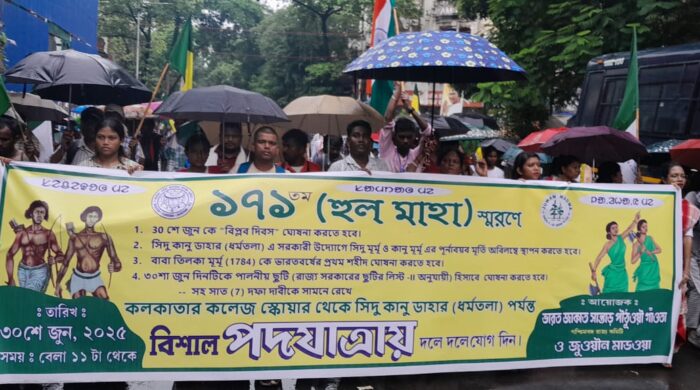 সমরেশ রায় ও শম্পা দাস,কলকাতা(পশ্চিমবঙ্গ) প্রতিনিধি: কলেজ স্কোয়ারে বিভিন্ন জেলা থেকে আগত আদিবাসী সম্প্রদায়ের মানুষেরা জমায়েত হন, সকাল থেকেই প্রচন্ড বৃষ্টি হওয়ার ফলে হতে দেরি হয়, মিছিল এক টা নাগাদ